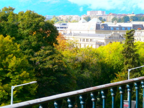 Derrière son ordinateur, Alexandre Simon gère l’envoi de séquences vidéo qu’il a prises à travers Genève. Comme je le comprends, ces séquences, projetées sur les panneaux gris, constituent l’ossature visuelle de la pièce. Au fil des scènes, elles créent l’illusion d’une déambulation à travers différents quartiers – une immersion dans la ville, sans quitter son siège de théâtre. On passe d’une rue remplie de circulation (à la Jonction ?) à des balcons qui fleurent bon les années 1960, avant de voir son regard accroché par les flancs du Salève.