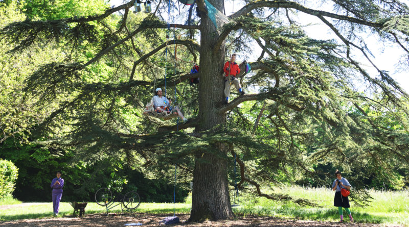Lorsque j’arrive dans le Parc de la Mairie de Vandoeuvres, ma première réflexion est que le spectacle porte bien son nom. Et pour cause, Magali Heu et Lara Khattabi sont perchées dans un grand cèdre, la première dans une nacelle, la seconde directement sur une branche. Alors qu’elles répètent une scène, Mathias Brossard, qui signe la mise en scène du spectacle, donne quelques indications, échange avec les nombreux·ses membres de la troupe (au total, une vingtaine de personnes sont impliquées), pendant que Piera Bellato, qui l’assiste, note plein de choses dans son petit carnet. Si l’équipe est aussi nombreuse, c’est que ce spectacle a la particularité de pouvoir être joué, en alternance, par trois équipes de quatre comédien·ne·s.