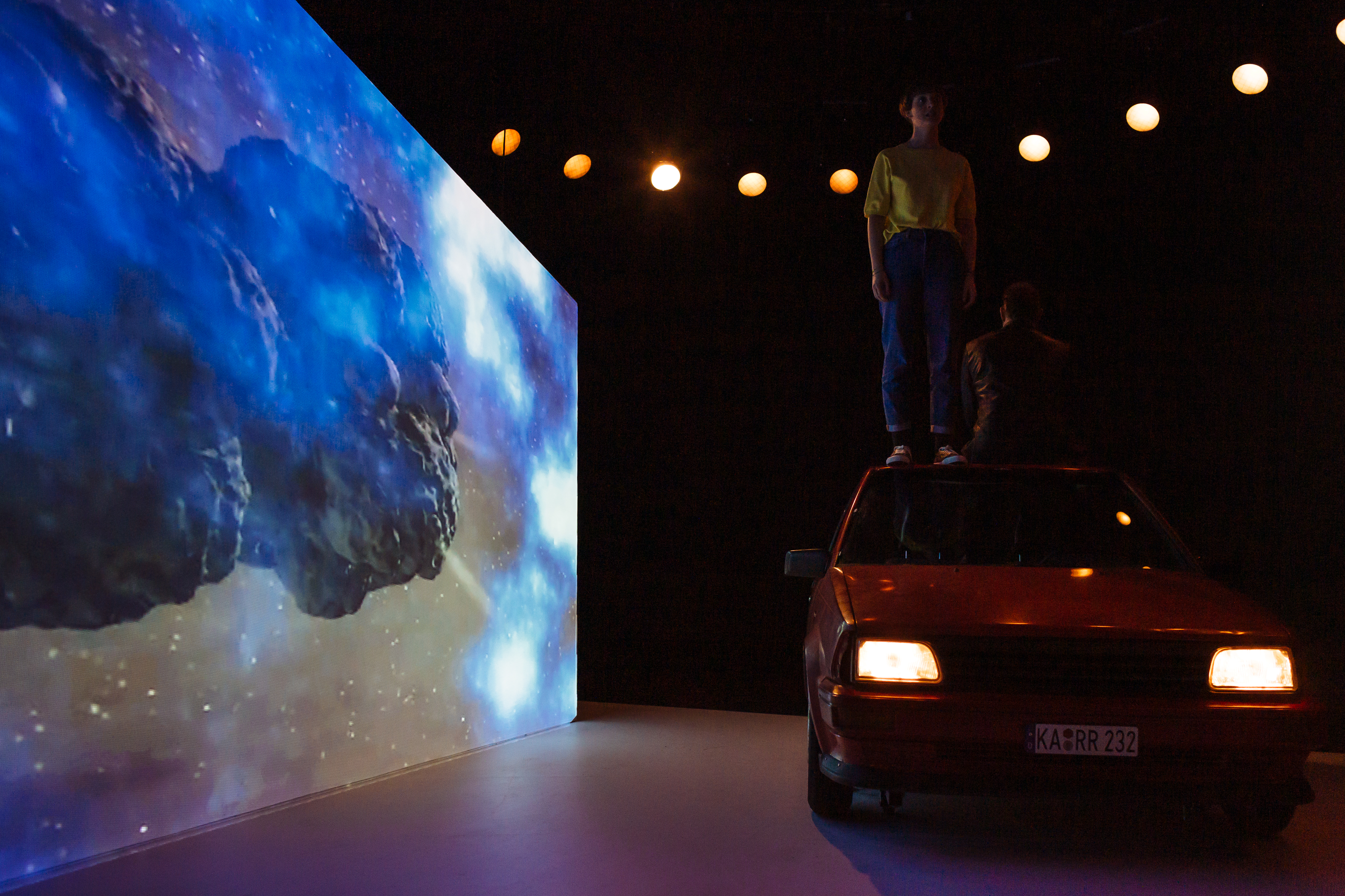 Un road trip. C’est ainsi qu’est présentée cette pièce. Lui (Fred Jacot-Guillarmod) doit aller vendre une voiture à Moscou. Elle (Christina Antonarakis) a soi-disant un rendez-vous là-bas pour son doctorat. Pendant trois jours, depuis Berlin, ils vont rouler vers la Russie et parler, retourner sur les traces de leur identité. Durant une heure, il sera question d’effondrement : celui du passé, de la relation entre eux, de leur monde intérieur. De l’effondrement politique de l’URSS, aussi. Le lien entre tout cela ? La science qui, sous forme de métaphore, celle de La chute des comètes et des cosmonautes, vient tenter de répondre à ces questionnements latents.