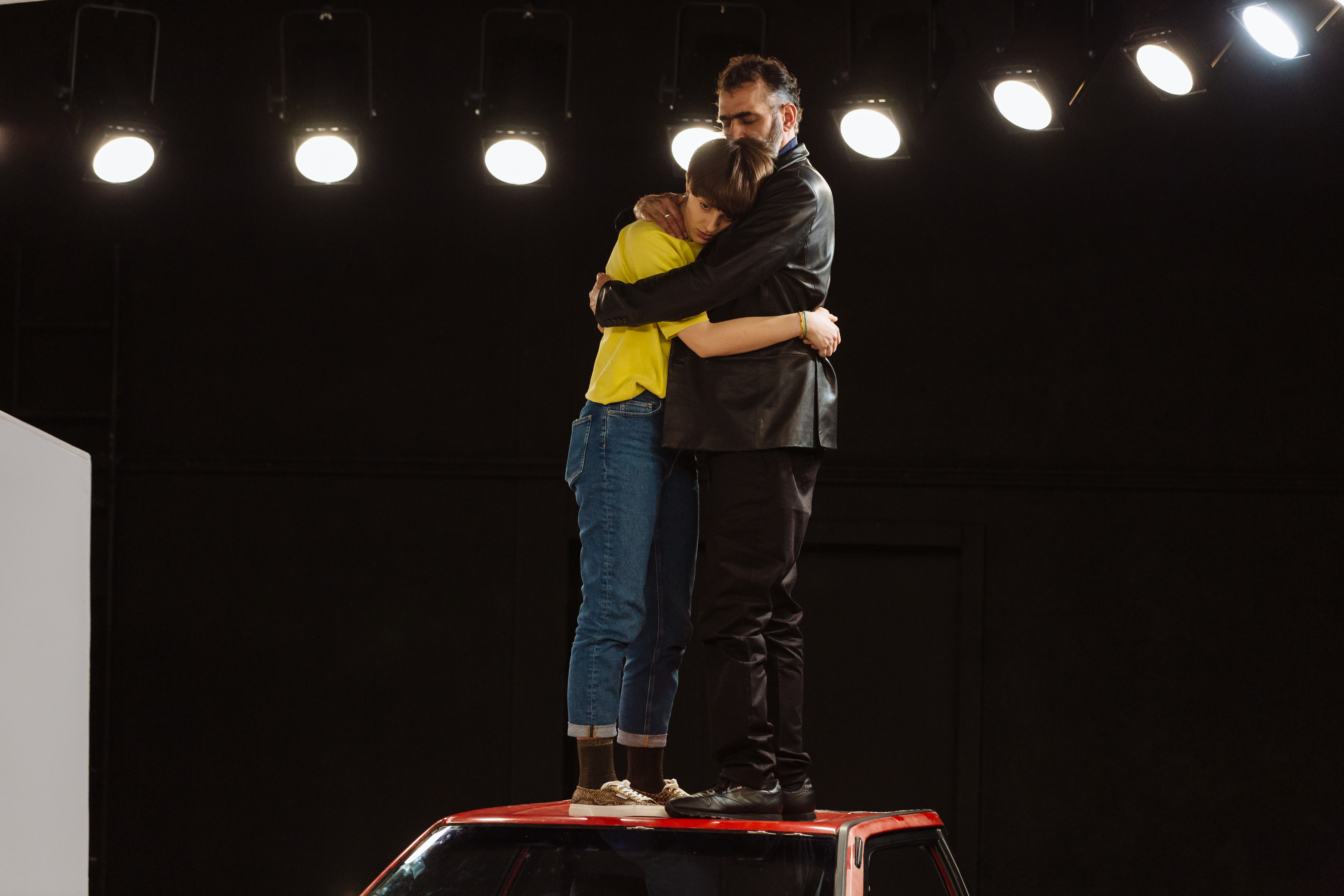 Dans ce road trip, il y a d’abord la relation père-fille, qui constitue les seuls moments de dialogue entre eux. On sent les rapports tendus, avec cette rancœur dans l’air, sans qu’on sache vraiment pourquoi au début. Puis les langues se délient. Elle demande à son père de lui raconter l’histoire de son passé, comment ils ont quitté l’URSS pour s’installer à Paris, quel a été l’accueil. Un ton de reproche se fait alors sentir. Elle n’a pas été désirée. C’est pour elle qu’ils sont partis. C’est la base de tout, l’effondrement initial qui a précédé tous les autres. Et pourtant, on sent une certaine affection entre eux, celle d’un père pour sa fille, et inversement. La fin de la pièce les liera, pour toujours.