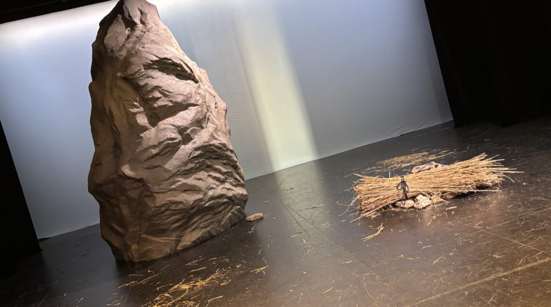 La salle de spectacle disparaît dans les ombres. Je devine un rocher gigantesque, d’un gris anthracite. Avec la pénombre qui s’y accroche, on dirait presque un visage minéral de l’Île de Pâques – nez enfoncé dans les replis de la pierre, bouche fendue avec sévérité. Au sol, une gerbe de paille grossièrement nouée, dont des épis s’échappent. Un gigantesque écran blanc habille le mur du fond du plateau. Un cadre épuré, parfait pour l’intrigue de Hé, Prométhée !, dans laquelle un randonneur solitaire part à la recherche du Titan mythologique pour le confronter à ses actes – ce don du feu (concret ou intérieur) qu’il a fait à l’humanité après l’avoir dérobé à l’Olympe.