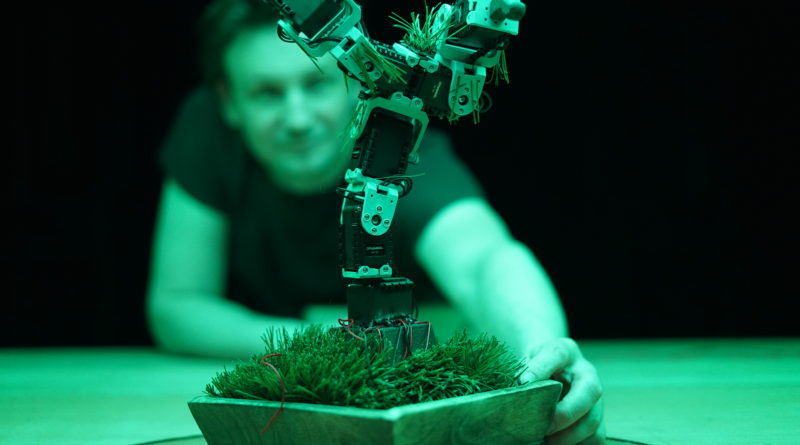 Bien sûr, c’est une construction narrative qui vise avant tout à nous faire réfléchir sur l’art, son rôle et son importance, son prix… mais aussi sur la fonction que nous, le public, nous sommes d’accord (ou non) d’y jouer. Devenons-nous des consommateur/trices ? Des co-créateur/trices ? Des mécènes ? Un peu de tout ça ? Le spectacle s’achève par un appel à notre participation, puisqu’autour de la table-établi, plusieurs hautes vitrines sont disposées. Dans chacune, un robot attend que nous le touchions, tandis que d’autres sont programmés pour expérimenter seuls et choisir les meilleurs combinaisons… le tout évoque un croisement entre une Exposition Universelle du futur et un cabinet d’exposition steampunk – entre Jules Verne et Isaac Asimov. Enfants comme adultes s’y ébattent avec joie, heureux/euses d’expérimenter à leur tour avant de quitter le théâtre.