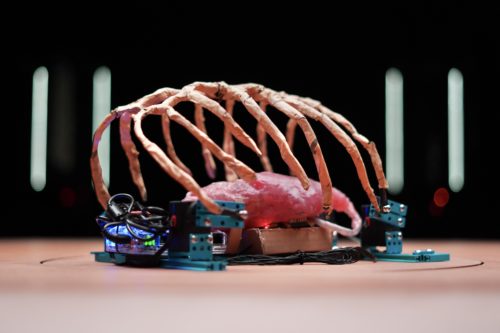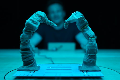Après s’être trituré les méninges, le chorégraphe est arrivé à une solution simple : faire danser des robots plutôt que des humain-es. Après tout, les robots ne mangent ni ne dorment… et en plus, il ne faut pas les payer. Ni une, ni deux, Ugo Dehaes a acheté son premier robot sur Amazon. Le voilà, tout en métal et en clignotements lumineux, qui commence à se mouvoir sur la table. À quoi ressemble-t-il ? Les enfants émettent plusieurs hypothèses : une cage thoracique, des arrêtes de poisson, une araignée retournée sur le dos… C’est vrai que la bestiole posée devant nous, avec ses espèces de longues pattes qui font penser à des côtes, tient un peu de tout ça. C’est le premier robot qu’Ugo a acheté.