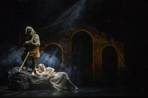 Le pont d’un navire en mer. Tout est calme – c’est la nuit. Soudain, le vent se lève. Tumultes, fracas, il s’engouffre dans les voiles géantes, presque translucides, qui s’échappent du plafond en drapés aériens. Éclairs, tonnerres, le monde disparaît dans la fumée, les soulèvements d’écume. Un cri : « Nous coulons ! ». Les voiles s’évanouissent, le bateau disparaît. Alors – plus rien. Juste le ressac sur les récifs, le jeu miroitant des lumières sur un tapis de fumée figurant l’onde des vagues avec une hypnotique poésie. Une jeune fille se penche sur l’eau. Elle s’appelle Miranda (Marie-Evane Schallenberger). Son père, le vieux Prospero (Karl Eberhard), est un puissant sorcier qui règne sans partage sur l’île. Aidé par Ariel, l’esprit des airs Ariel (Jeanne Pasquier), il a provoqué la tempête… en prenant garde que personne n’y périsse. Pourquoi ? Par vengeance et par amour – comme souvent dans les histoires.