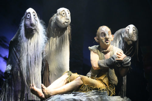 L’interprétation de Jeanne Pasquier n’est pas étrangère à ce sentiment : elle transforme Ariel en une créature mi-fée (Clochette n’est pas loin, car l’île ressemble par bien des aspects au Pays Imaginaire créé par J.M. Barrie), mi-oiseau, tantôt Cupidon, tantôt Pan. Ariel, en tant qu’esprit servant un humain, fait le lien entre le monde du rêve et celui du réel, un jeu d’équilibre délicat qui se ressent dans le ton, les gestes, les expressions du visage de la comédienne. Face à elle, le Caliban campé par Antoine Joly n’en paraît que plus lourd, plus terrestre – comme un golem coincé dans un songe. Pourtant, c’est lui qui parle le mieux de l’oppression subie ; c’est avec lui que nous nous insurgeons, pour lui que nous avons soif de liberté. Quant à Karl Eberhard, il incarne un Prospero complexe, dans un jeu qui superpose les niveaux de sens. De père aimant, il devient sorcier puissant, puis victime injustement trahie. Plus tard, il est maître, marieur et juge. Karl Eberhard lui confère un caractère aussi changeant que la magie dont il use, où la colère le dispute souvent à la mansuétude. Si Ariel évoque la dimension onirique de La Tempête et Caliban son message, Prospéro représente quant à lui sa force narrative : double de l’auteur, double du metteur en scène, c’est lui qui a le fin mot de l’intrigue.