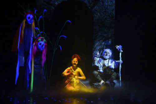 La Tempête, telle que la rêve Omar Porras, est plus qu’une pièce – c’est un tour de magie. L’île de Prospéro n’est pas celle de Robinson ; on s’y échoue, certes… mais on s’y retrouve surtout victime d’enchantements. De la scénographie aux costumes, de la lumière à la musique, des masques aux marionnettes, on flotte dans un univers imaginaire nourri de références au cinéma, à la littérature et à l’animation. Pendant le naufrage, on se souvient les tempêtes du Master and Commander réalisé par Peter Weir en 2003 ; dans le jardin de Prospéro, c’est un peu d’Alice au Pays des Merveilles de Lewis Caroll qu’on retrouve. Lorsque le roi de Naples et sa suite se perdent dans les cauchemars d’une forêt marécageuse, le Blanche-Neige de Disney vient immédiatement à l’esprit. Mais ce sont peut-être les références à un animisme chamanique proche de celui d’Hayao Miyazaki (Princesse Mononoké, 1997) ou des systèmes de croyances sud-amérindiennes qui frappent le plus. À mesure que la pièce avance, qu’Ariel et Caliban (respectivement esprit endémique et véritable indigène de l’île) revendiquent leur liberté avec plus de force, l’île elle-même devient plus sauvage, plus rebelle, plus magique. D’étranges créatures, muettes et masquées, y apparaissent : d’abord grises silhouettes, elles se parent de couleurs grâce à l’usage de la lumière noire. Leurs ornements rappellent les tableaux de Frida Kahlo, ou l’iconographie du Jour des Morts, fête chrétienne célébrée au Mexique et mêlée de croyances précolombiennes. La vraie voix de l’île s’exprime là – dans les sons qui bruissent autour de ces êtres protecteurs, cette nature qui se mêlent aux mots prononcés par Ariel, par Caliban, pour retrouver la liberté volée.