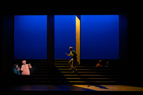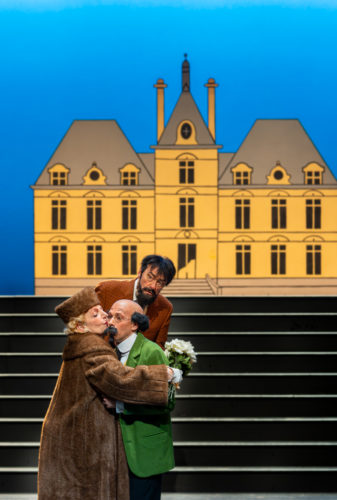 Commençons donc par le cadre : tout est fait pour nous rappeler la bande dessinée. D’abord, il y a ces escaliers que l’on peut faire bouger de cour à jardin, déplaçant les murs qui en constituent les limites. Lorsque ceux-ci ne sont pas alignés, ils créent différentes cases – dont certains personnages se servent pour se cacher – qui rappellent évidemment celles de la BD. Les décors sont aussi parfaitement repris, en témoigne ce château de Moulinsart, ou ses tapisseries, que l’on aperçoit régulièrement en fond de scène. Très jolie trouvaille également que d’avoir agrandi certaines cases de la bande dessinée, comme lorsque l’harmonie de Moulinsart vient présenter ses hommages au futur mariage du capitaine Haddock, et que seule la tête du comédien sort de ce qui est devenu un tableau, pour jouer la scène comme si elle sortait directement de l’œuvre d’Hergé. On évoquera enfin ces modules qui se déplacent, eux aussi, de manière uniquement latérale, et sur lesquelles se trouvent régulièrement les personnages. On peut y voir une allusion aux figurines dérivées de la BD, mais aussi une envie de jouer sur l’effet 2D de cette dernière.