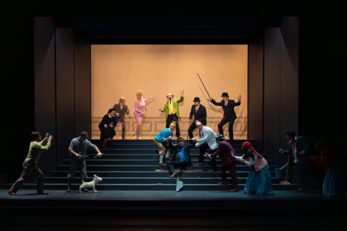 Enfin, il nous faut évoquer le mouvement donné à une œuvre originellement statique. Pour ce faire, on apprécie beaucoup les cascades : mention spéciale à celle d’Irma (Brigitte Raul), par-dessus le canapé, et à toutes les chutes dans l’escalier, à cause de cette satanée marche. Un gag récurrent dans la bande dessinée, parfaitement retranscrit à la scène. On a déjà évoqué la gestuelle de Tintin, on pourra encore parler des fresques qui ponctuent chacune des deux parties. Tout-tes les comédien-nes se retrouvent sur la scène, dans une pose statique, emblématique de leur rôle, pour illustrer l’impressionnante galerie de personnages imaginée par Hergé et retranscrite sur la scène. Un spectacle grandiose, réconfortant à l’approche de l’hiver, avec cette nostalgie de l’enfance qui nous envahit. Un pur divertissement dont il faut souligner l’impressionnant travail, tant au niveau du jeu que du décor et de tous les éléments de scénographie. La partition est millimétrée, et le plaisir du jeu s’en ressent. L’ovation et les nombreux rappels – moins nombreux, tout de même, que les quinze adressés à Bianca Castafiore à la Scala de Milan – en sont les preuves !
