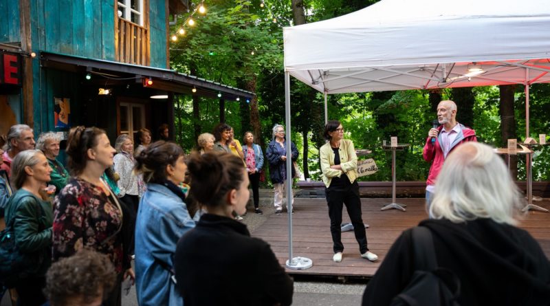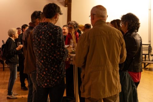 En guise d’introduction, Gabriel Alvarez a tenu à remercier toute l’équipe, qu’il s’agisse des fondateur/trices ou de celles et ceux qui sont arrivé-es au fil des ans. Désigné-es comme des « rameurs » qui œuvrent pour faire de ce lieu si chaleureux ce qu’il est aujourd’hui, il n’a pas manqué d’insister sur la précarité de la situation de la culture. Nathalie Tacchella a d’ailleurs embrayé en invitant chacun et chacune à signer l’initiative visant à garantir qu’au moins 1% du budget de fonctionnement annuel du canton soit alloué à la culture. Pour conclure sur ce chapitre des « rameurs », Gabriel Alvarez a souligné le magnifique travail de Camille Lacroix, graphiste de la saison, qui invite à ramer vers le haut, pour s’émanciper et découvrir les productions théâtrales et dansées de cette saison 25-26. Les deux co-directeur/trices des lieux nous ont présenté le concept de la soirée, dont le format a été réitéré, avant de laisser la parole aux artistes, autour des différentes tables, non sans avoir rappelé les événements de recherche et autres ateliers qui auront lieu tout au long de la saison. Nathalie Tacchella a conclu en évoquant le projet Récits potagers, en collaboration avec des cultivateur/trices de Cité-Jonction, et qui a abouti à un livre écrit par Justine Ruchat et illustré par Tom Tirabosco.