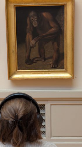 Durant cette déambulation sans parole, nous effectuons seulement quelques micro pauses, où Jacqueline nous indique des œuvres ou des détails auxquels porter attention. En n’ayant pas à réfléchir au trajet, on se laisse attraper par des peintures ou des objets qu’on croise, auxquel-les on n’avait jamais prêté attention. Puis, en disposant les tabourets face à face, nous prenons de nouveau place face à la comédienne, qui nous indique de prendre quelques profondes inspirations. Enfin, nous découvrons l’œuvre choisie pour nous, différente pour chaque performance, avec laquelle nous allons passer quelques minutes. Grâce à l’isolation du casque, la proximité avec la toile, ainsi que toute la mise en condition précédente, l’appréciation de la toile est optimale. Cet instant, dont nous ne connaissons pas la durée précise, permet de prêter attention au sujet, à la technique, au cadre, laissant libre court à notre ressenti, car aucune indication sur l’œuvre n’est donnée.