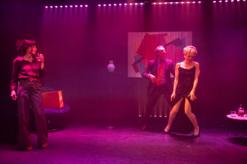 Si ce spectacle fonctionne aussi bien, c’est aussi parce qu’il est porté par d’excellent-es comédien-nes. À commencer, bien sûr, par Camille Figuereo. Avec sa perruque blonde courte, qui change de la longue chevelure brune qu’on lui connaît habituellement – et correspond donc parfaitement à la philosophie de la compagnie – elle joue impeccablement sur la personnalité borderline de son personnage. Les regards et son attitude semblent indiquer une certaine folie, tout en étant contrôlée par moments. Elle crée ainsi constamment ce sentiment de malaise qui jalonne toute la pièce. Sur le fil, Marie Druc – avec ses longs cheveux foncés, loin de sa chevelure blonde d’origine, jouant elle aussi sur les apparences – l’est également. Entre l’amitié, le soutien et la gêne qu’elle ressent, il fallait trouver un équilibre qui se joue sur des détails difficiles à décrire avec des mots. Enfin, Juan Crespillo sort du registre du bellâtre séducteur qu’on lui connaît souvent. Quel plaisir de le voir incarner un Alfredo quelque peu éméché, qui parle fort et arbore constamment un sourire niais. Il apporte ainsi la dimension plus légère et humoristique qu’il fallait à ce spectacle aux thématiques profondes.