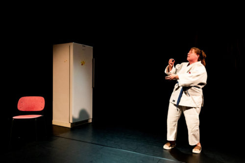 Les portes du frigo s’ouvrent. On s’agite derrière les casseroles. Les informations s’enchaînent très rapidement sur scène : Charlotte Riondel n’y va pas par quatre chemins, le message semble urgent… il faut désormais faire taire tous les levains grossophobes qui tapissent le fond de nos cœurs. Comment remédier à un béant besoin d’amour dans une société où être gros-se est un problème alors qu’être gourmand-e serait plutôt chic ? La question nous parvient comme une batte de baseball. La faim et l’amour ne sont-ils pas simplement universels et ouverts à tou-te-s ? Hé non.