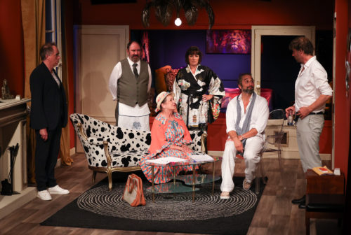 Cette femme, incarnée par Hélène Hudovernik, il faut d’ailleurs en parler. Elle apparaît très juste dans son rôle d’épouse en pleine reprise de pouvoir et d’affirmation de soi, qui jongle également à la perfection avec le nouveau rôle qui lui est assigné par la situation après l’arrivée de Mlle Bouillon. Juliet Kennedy est, quant à elle, la seule à incarner deux personnages distincts. Son accent russe exagéré – avec quelques drôles d’erreurs de français – lorsqu’elle est Elena provoque l’hilarité du public, tandis qu’elle incarne, en apparence du moins, ce qu’on pourrait qualifier grossièrement de « potiche » dans le rôle de Mlle Boulet. Mais ne vous y trompez pas, toutes deux sont plus affirmées qu’il n’y paraît et agissent comme détonateurs de certaines situations. Reste encore Olivier Lambelet, parfait dans son rôle d’amant épris et un peu benêt, qui débarque en ne comprenant absolument rien à la situation, lui qui veut seulement courtiser Cyrielle, mais n’a rien à voir avec les autres. Enfin, il nous faut souligner la brillante Véronique Mattana, la vieille auteure un peu perdue et plus passionnée par ses chiens que par les êtres humains. Elle s’avérera bien plus complexe qu’il ne le semblait, et cette gentille dame puritaine sait bien ce qu’elle veut… Il ne reste plus qu’à découvrir les intrigues construites par cette jolie bande de personnages hauts en couleurs !