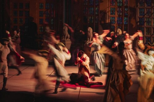 Peu à peu, les capes tombent. Apparaissent des justaucorps couleur chair, traversés de dentelles évoquant un squelette stylisé. La chair imite l’os. Le vivant se laisse traverser par l’idée de la mort. Jusque dans les demi-masques en dentelles. La danse se fait alors double : organique au sol, spectrale dans le reflet. Les interprètes participent d’un même mouvement, mais sans hiérarchie, sans centre. Là où d’autres versions du Boléro structurent l’espace autour d’une figure aimantée, ici chacun-e attire et repousse, chacun-e brille, puis s’efface dans quelque chose qui ressemble à une respiration cosmique, vitale et funèbre.