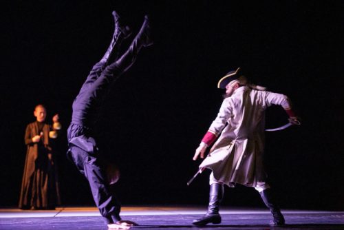 Certaines images restent accrochées longtemps après : un alignement de danseuses transformées en escadron d’exécution, les armes imaginaires pointées vers le public ; un danseur étendu au sol, pantin presque mystique qu’un militaire abat symboliquement et qui se relève sans cesse dans des mouvements tuilant le circassien acrobate, le lin-hop, le hip-hop et le contemporain. Cet interprète, Dylan Philips, retient particulièrement l’attention : un danseur acrobate au mouvement ondulant, dont la médusante souplesse n’a rien d’un effet spectaculaire gratuit. Il incarne une figure étrangère, rejetée puis réaffirmée, un corps qui tombe, blessé, tué, meurtri mais qui refuse de céder. Sa présence donne un axe au chaos ambiant. Il ne cesse de recomposer et décomposer son corps aux lignes ductiles sous les assauts d’un soldat.