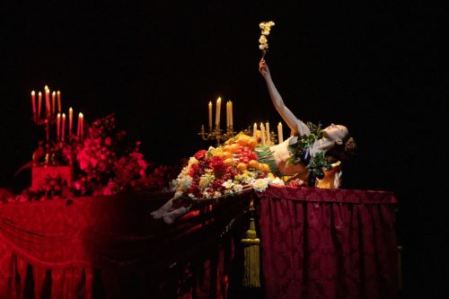 Les costumes et les décors (une immense demeure aux vitraux d’Eglise et lions de pierre) sont signés Tim Yip. L’homme est fort entre autres d’une cinquantaine de collaborations pour des films d’arts martiaux. Par ailleurs, il est le seul artiste chinois jamais oscarisé à Hollywood, pour Tigre et dragon d’Ang Lee. Ses habits de scène jouent d’abord la carte de la théâtralisation historique refigurée : robes ouvertes à l’avant ou à l’arrière, silhouettes théâtrales avec larges robes déployés. Ce moment avec deux interprètes déployant leurs robes en éventail dessine une performance en tableaux vivants oscillant entre le queer et le voguing. On se rappelle alors sa gestuelle gelée par à-coups tant célébrée par Madonna dans sa chanson iconique, Vogue : « What are you looking at / Strike a pose… ». Elles évoquent des figures d’aristocrates se gorgeant sensuellement de raisins comme surgies d’une composition pop et déliquescente, sensuelle et baroque du photographe américain David LaChapelle.