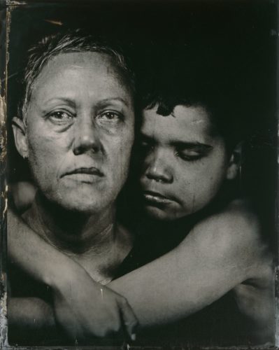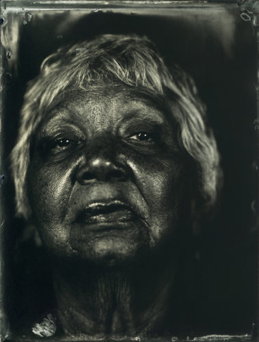 Devant certaines images, on a l’impression que les visages ont traversé une nuit dense pour arriver jusqu’à nous. Dans Naabámi (tu verras): Barangaroo (armée de moi), série maîtresse de l’artiste, de grandes figures de femmes et de jeunes filles autochtones d’aujourd’hui surgissent de l’ombre, comme peintes à l’encre ou révélées dans le charbon. Le procédé évoque les ferrotypes du XIXe siècle – ces photographies gravées sur plaques métalliques – mais ici, la monumentalité renverse la perspective : ce ne sont pas des reliques, ce sont des présences.