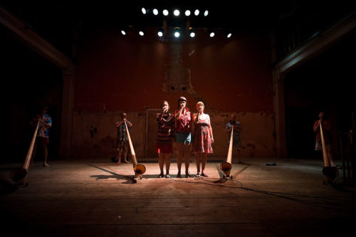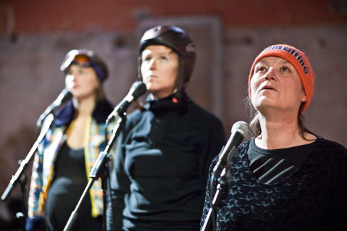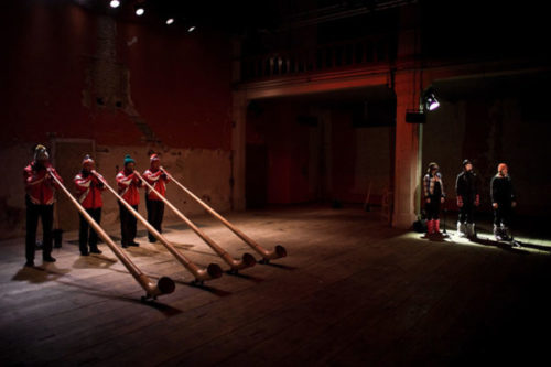 Sur scène, quatre cors des Alpes qui, dans une esthétique réussie, s’amusent à créer des arrangements symétriques entre eux. Et trois comédiennes derrière leur micro. Presque trois générations de femmes « de là-haut ». Statiques, un peu estomaquées, elles font l’inventaire du temps d’un monde disparu à la manière du Je me souviens de Georges Perec : C’était nous le temps d’avant, celui des ateliers de fartage, des bonnets Ovomaltine et Crédit Suisse, des Subaru 4×4, des anoraks (qui dit encore ce mot aujourd’hui ?), des carnotzets chaleureux, des gants qui sèchent sur le radiateur, des pas qui crissent sous la neige en allant à la messe de minuit, des ratracks qui font de la lumière dans la montagne au crépuscule, de l’or blanc à Noël puis à Pâques, puis plus à Noël mais encore à Pâques et puis plus du tout, ni à Noël, ni à Pâques… C’était nous qui nous occupions de vous et qui connaissions vos habitudes… C’était nous les anciens paysans devenus riches… C’était nous qui avions une identité et qui aujourd’hui n’avons plus rien du tout, obligés de descendre dans la plaine faire la manche…
